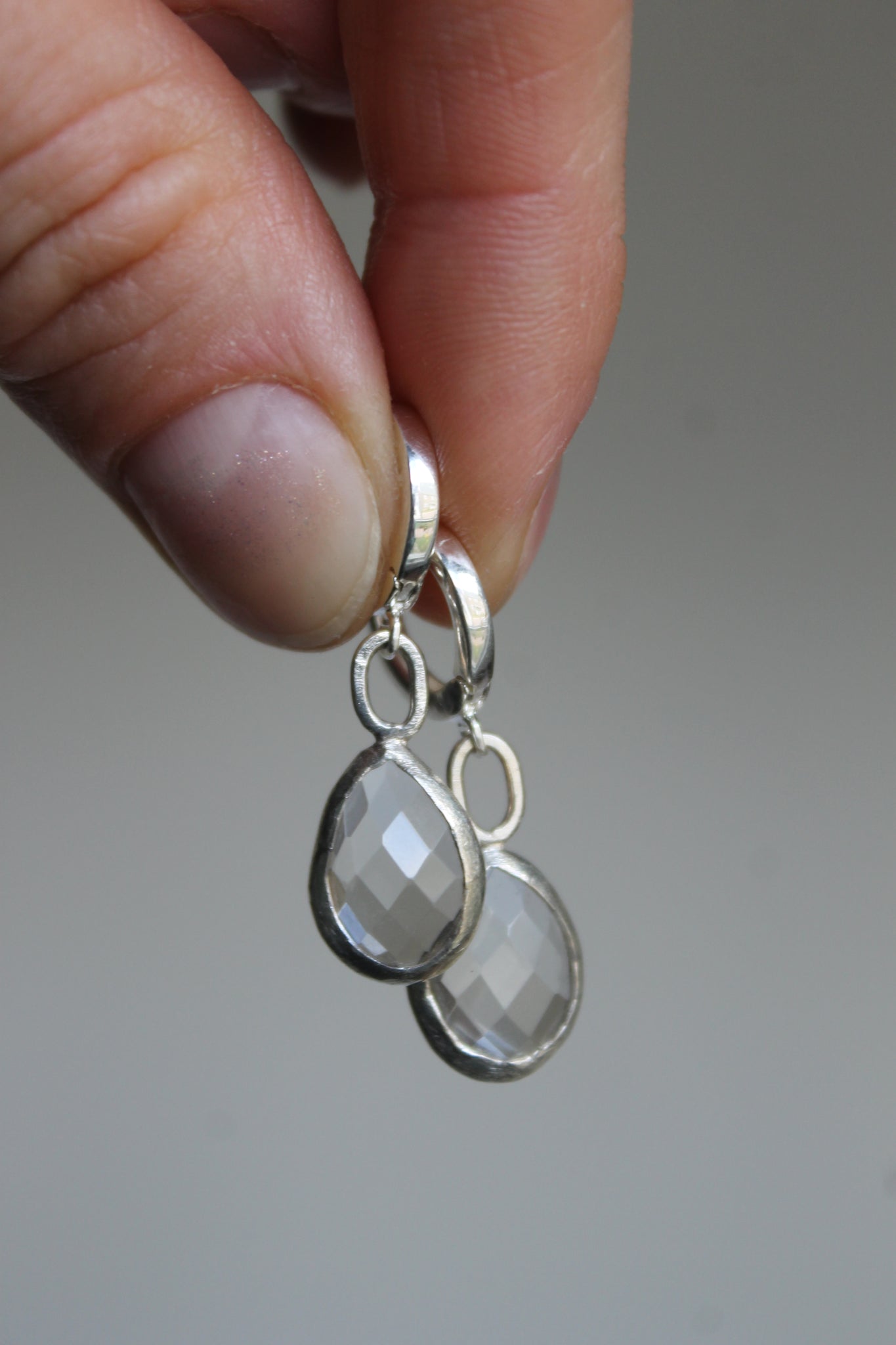 The clear quarts was carefully encased in silver, and attached to sterling silver huggie hoops. These earrings are lightweight and comfortable to wear.