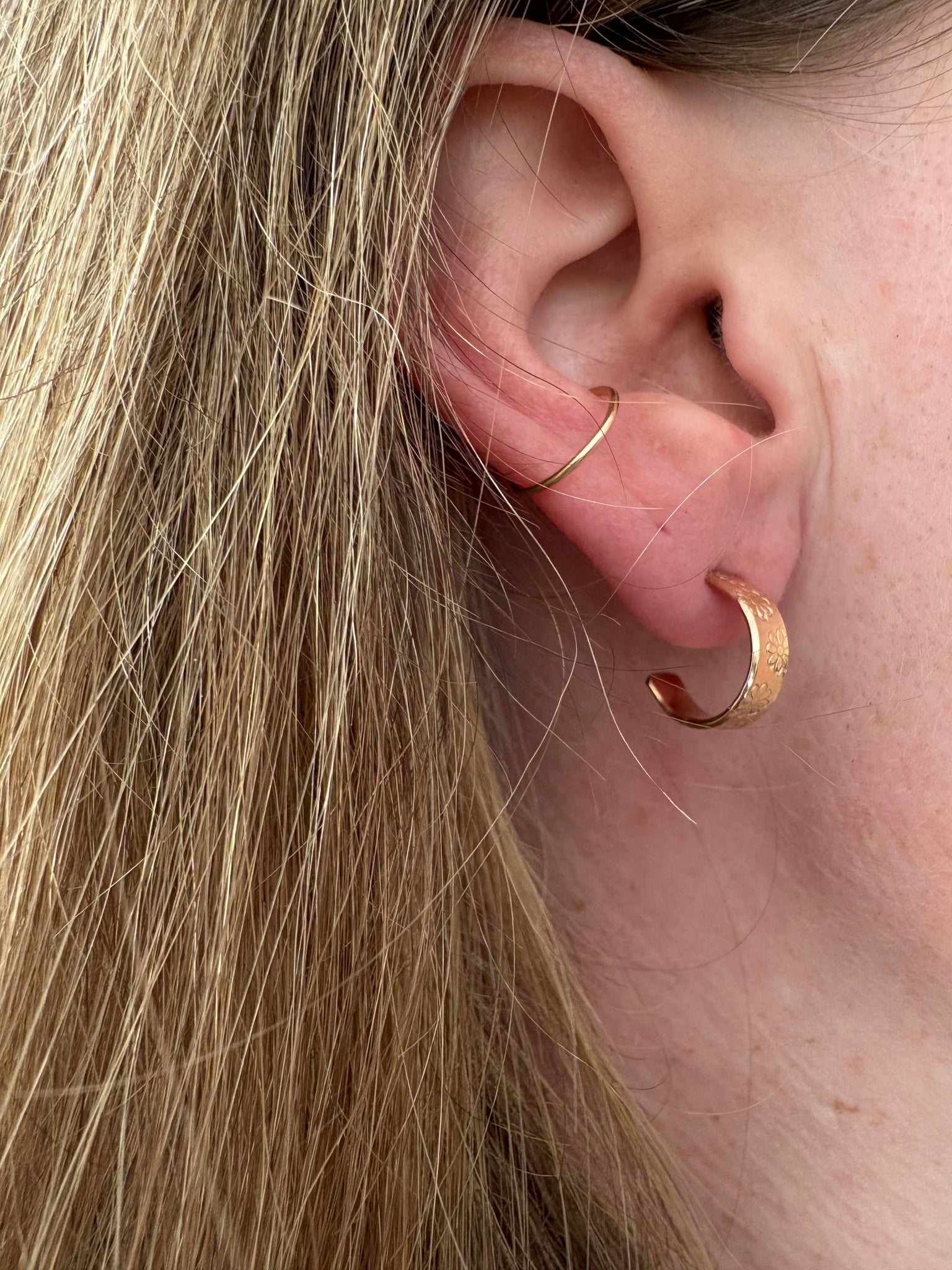 These earrings are made using gold filled wire and are each hand stamped with tiny daisies. Since they're handmade, each one is slightly different!