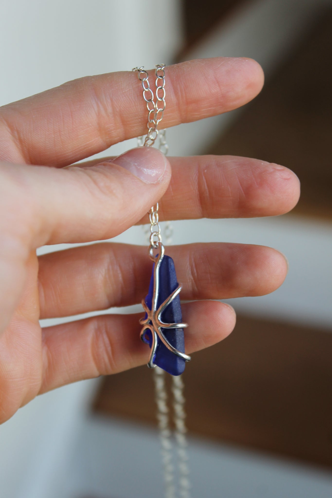 The claw setting was created with sterling silver wire, cut, filed and soldered into a perfect setting for the seaglass to showcase the front and back.